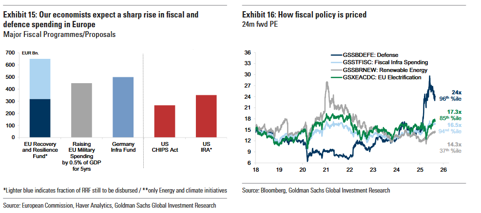 Dodatkowo Goldman wyróżnia koszyk GSSTFISC - spółki korzystające na rosnących wydatkach publicznych i obronnych oraz zachętach do inwestycji prywatnych, zwłaszcza w Niemczech. To bardziej zdywersyfikowana i tańsza alternatywa wobec czystej ekspozycji na obronność.