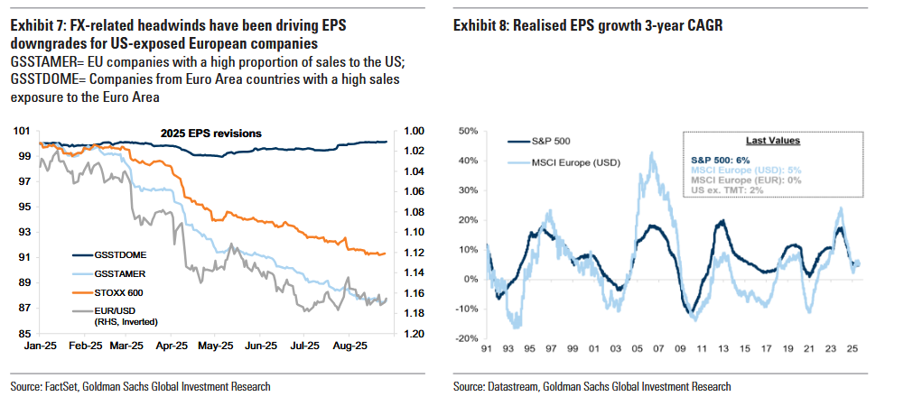 Najważniejszy „warunek brzegowy” to waluta. EUR/USD = 1,25 w prognozie na 12 miesięcy to mechaniczny cios w zbiorcze EPS Europy rzędu 2–3 pkt proc. na każde +10% umocnienia euro. Dlatego strategia „bliżej domu” - spółki z przychodami generowanymi głównie w Europie - ma przewagę nad eksporterami do USA.