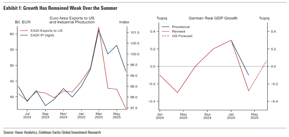 Po wakacjach obraz aktywności jest rachunkowy, a nie alarmowy. Rewizja niemieckiego PKB za II kwartał do –0,3% k/k oraz miękki odczyt produkcji w czerwcu dociążyły wynik całej strefy euro. W efekcie Goldman obniża szacunek wzrostu na trzeci kwartał do „blisko zera”. Ważny detal: to w dużej mierze „oddanie” wcześniejszego przyspieszenia eksportu, które było napędzane wyścigiem przed nowymi amerykańskimi cłami.
