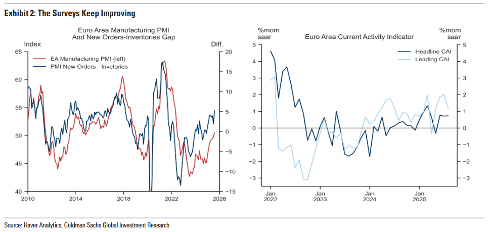 Dlaczego w bazowym scenariuszu Goldman nie widzi pogorszenia, tylko pauzę? Bo zestaw ankiet - od PMI po niemiecki Ifo - systematycznie się poprawia, a składowe wyprzedzające (np. luka zamówienia–zapasy) wskazują na odbicie w kolejnych kwartałach. Mówiąc prościej: poziomy wciąż są umiarkowane, ale dynamika jest coraz lepsza.