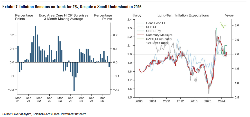 Na poziomie cen wreszcie bez dramaturgii. „Flash” na wrzesień to ~2% HICP i ~2,2% core, a wskaźnik trendu bazowego Goldmana oscyluje wokół ~2,2% annualizowane. Bank dopuszcza niewielkie „niedobicie” celu w 2026 r. (silniejsze euro, tańsze surowce, przekierowanie eksportu z Chin), ale powrót do 2% w 2027 r. zostaje w bazie.