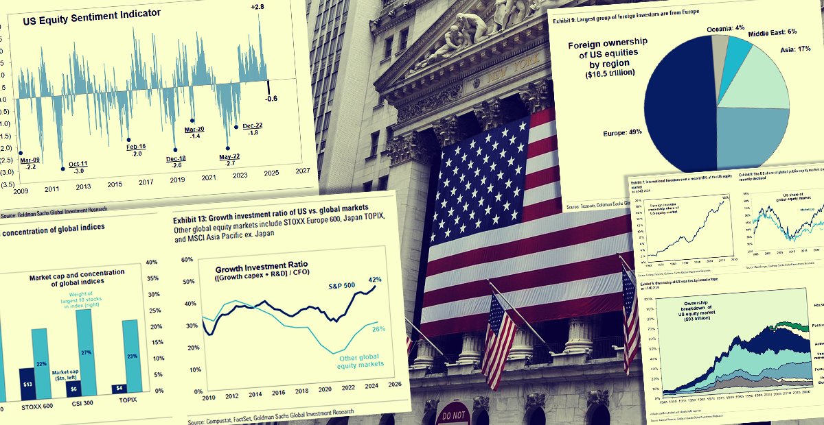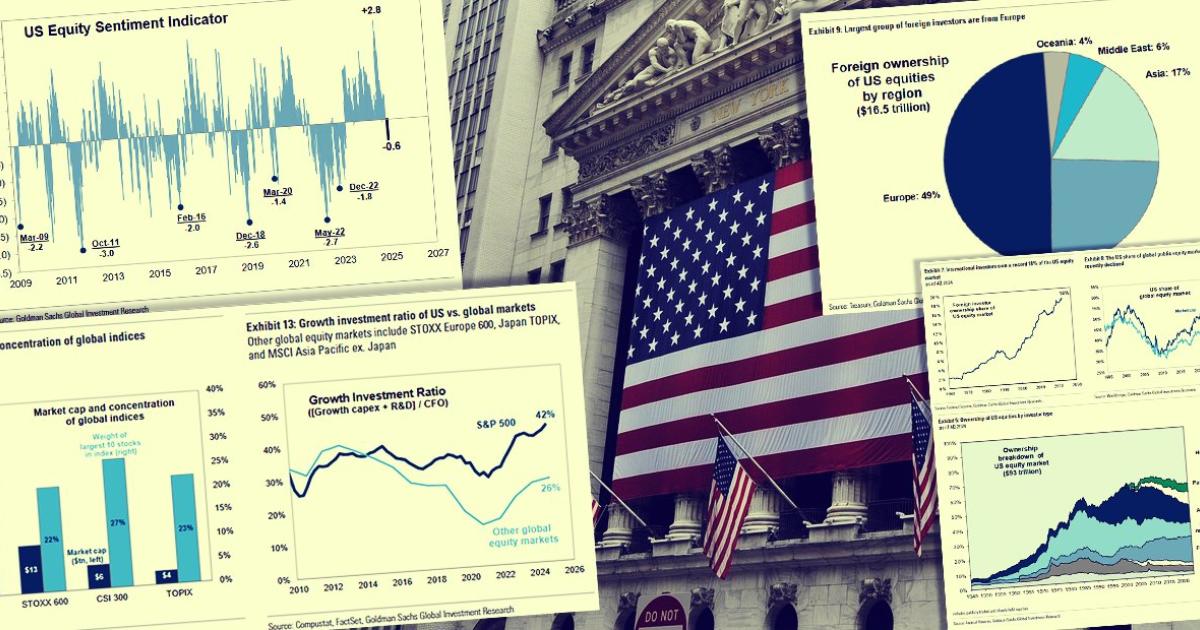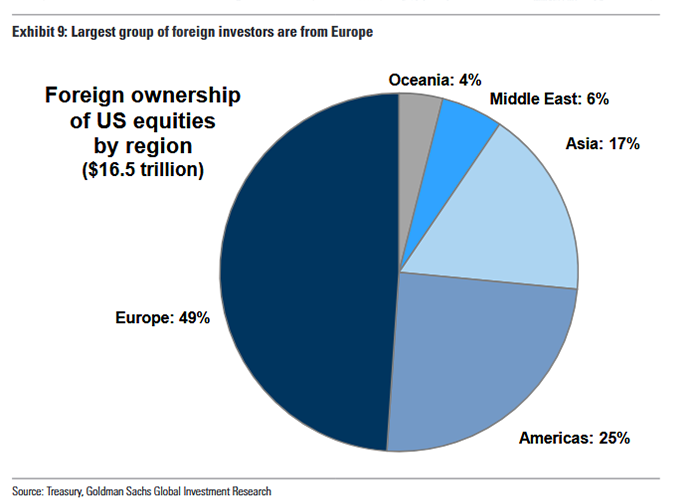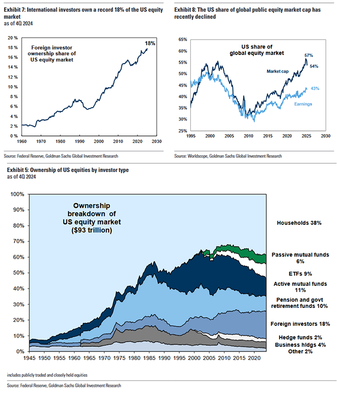 Dane z Rezerwy Federalnej pokazują, że zagraniczni inwestorzy posiadają rekordową ilość akcji amerykańskich firm. W 1960 roku zagranica posiadała tylko 2% amerykańskich akcji, w 2000 roku było to 7%, a na początku 2025 roku stanowiły już 18%. Z kolei 49% zagranicznych inwestycji pochodzi z Europy.