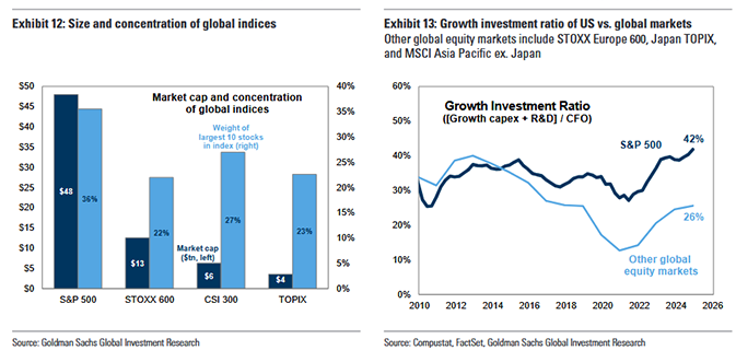 „Amerykańskie akcje wykazują prawie trzy razy większą średnią dzienną rotację niż akcje niena amerykańskie” – podkreślają analitycy Goldman Sachs, zaznaczając, że przewaga płynności rynku USA jest kluczowym czynnikiem przyciągającym inwestorów zagranicznych. Dodatkowo, amerykańskie firmy inwestują w rozwój w sposób, który przewyższa inne rynki globalne. Raport wskazuje, że „Wskaźnik Inwestycji Wzrostowych” w USA wynosi 42%, podczas gdy średnia dla innych regionów to 26%.
