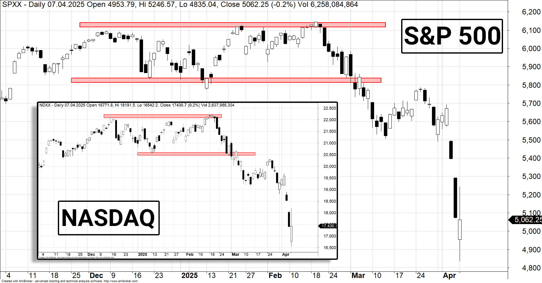 Wszystko zaczęło się od ogłoszenia nowej fali ceł, skierowanych nie tylko przeciwko Chinom, ale również wobec tradycyjnych sojuszników USA. W efekcie rynek – dotąd stabilny i odporny na rozchwianie – wpadł w spiralę nerwowości. Przez cztery kolejne sesje kontrakty terminowe na S&P 500 otwierały się spadkami przekraczającymi 1%, a w niedzielną noc notowania na moment runęły o ponad 5%. Taka sekwencja nie miała miejsca od 16 września 2008 roku – czyli poranka po upadku Lehman Brothers.