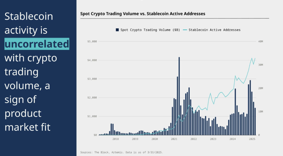 Według niego trend ten pokazuje, że stablecoiny przestają pełnić jedynie funkcję narzędzia do rozliczeń kryptowalutowych i coraz częściej są wykorzystywane w realnych transakcjach, zarówno w sektorze detalicznym, jak i instytucjonalnym. Co więcej, organiczny wzrost wolumenów nie jest skorelowany z ogólnym handlem kryptowalutami, co według Pierwienisa podkreśla dopasowanie stablecoinów do tradycyjnego rynku.