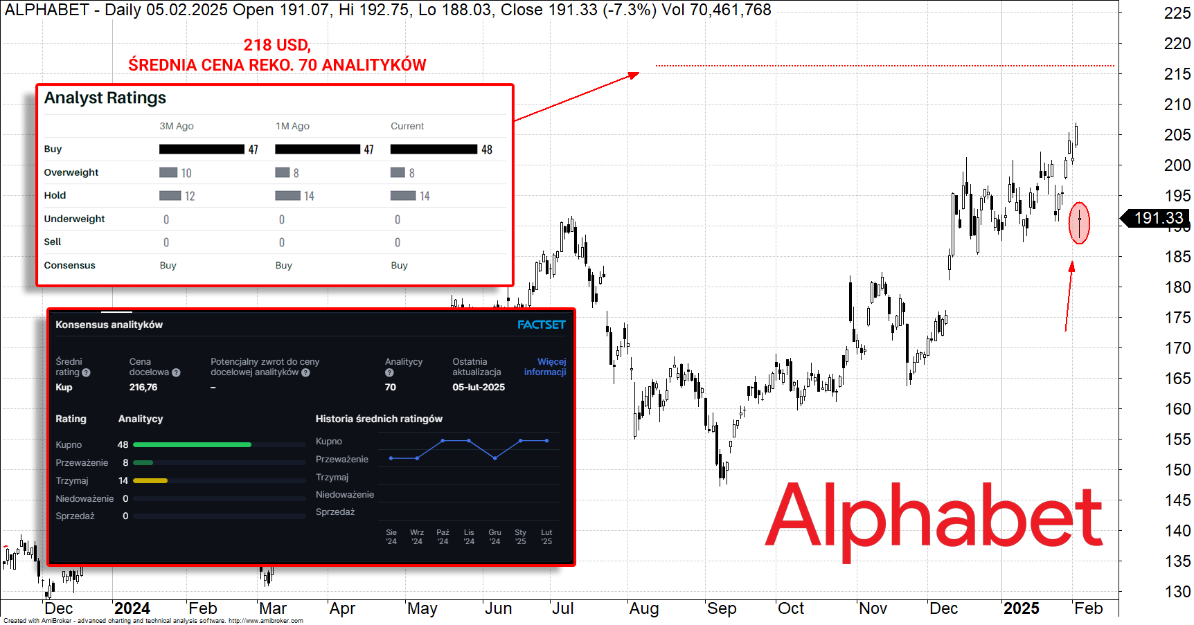 Akcje Alphabet zanotowały spadek o 7,4%, osiągając w środę wartość 191,10 USD. Powodem gwałtownej reakcji rynku były opublikowane dzień wcześniej wyniki kwartalne oraz plany zwiększenia nakładów inwestycyjnych o 43% w porównaniu z 2024 rokiem. Prognozy analityków zakładały wydatki na poziomie 57 miliardów dolarów, a więc znacząco niższe od rzeczywistej kwoty przedstawionej przez spółkę.