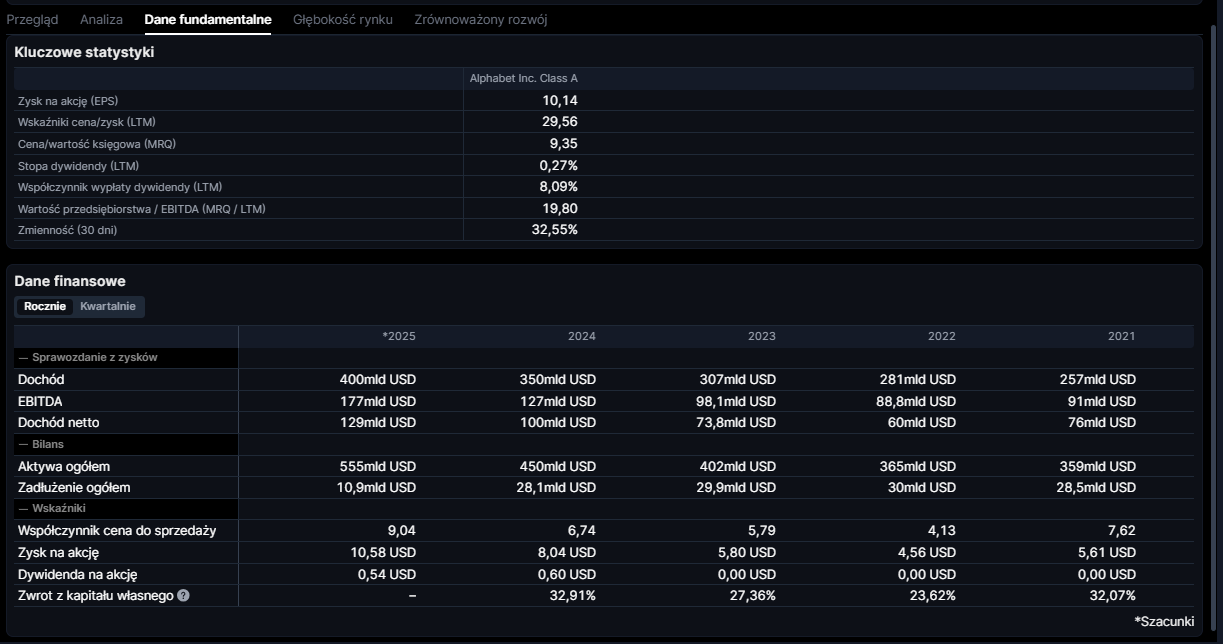 Żeby kurs Alphabetu „pracował” dalej, spółka musi dowieźć kolejne lata przyzwoitego wzrostu zysków. Obecnie konsensus na 2025 r. zakłada, że zysk na akcję przekroczy 10 USD, podczas gdy niespełna rok temu rynek liczył na ok. 9 USD. Jeżeli ta dynamika się utrzyma, w 2026 r. Alphabet musiałby zarabiać raczej 12-13 USD na akcję niż obecnie prognozowane 11 USD, żeby inwestorzy wciąż byli gotowi akceptować dzisiejsze mnożniki wyceny.