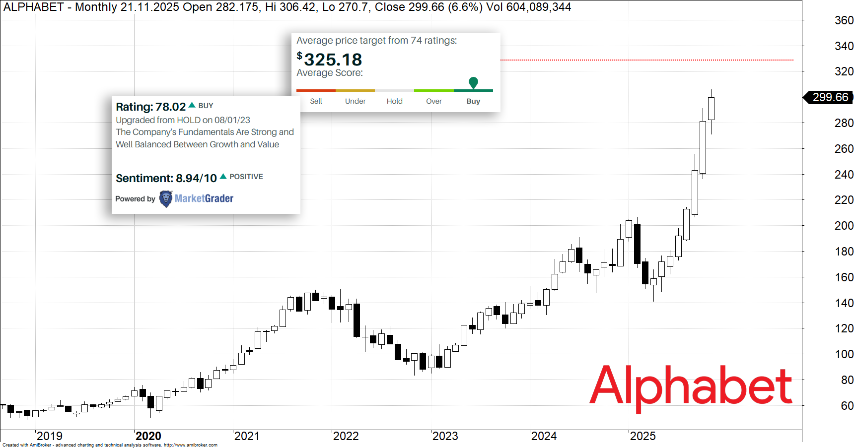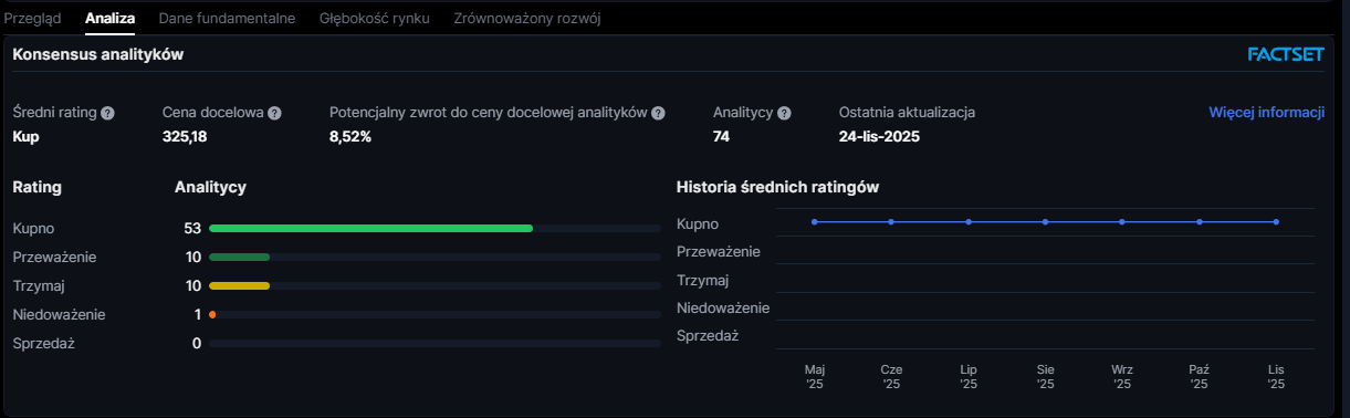 Podobnie widzi to Mark Mahaney z Evercore. Jego zdaniem Alphabet udowodnił, że potrafi przekuć AI w nowe produkty i nowe strumienie przychodów w praktycznie każdej linii biznesowej. Spółka nie jest już „klasycznym” przypadkiem wysokiej jakości kupowanej po zbyt niskiej cenie, ale fundamenty i tempo innowacji nadal robią wrażenie. Mahaney ustawia cenę docelową dla akcji Alphabetu na poziomie 325 USD.