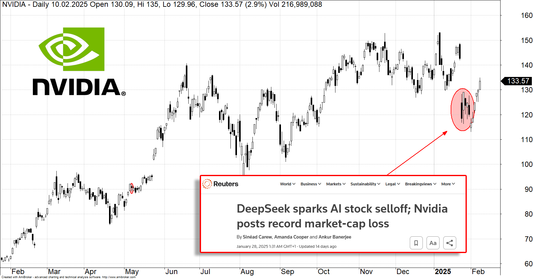 W ciągu ostatnich dwóch tygodni entuzjazm wokół nowych modeli AI opracowanych przez chiński start-up DeepSeek wywołał wzmożoną zmienność rynkową, wpisując się w tzw. big picture, czyli szerszy kontekst rozwoju sektora sztucznej inteligencji. Pojawiły się liczne spekulacje dotyczące tego, jakie konsekwencje może to mieć dla gigantów sektora, takich jak Nvidia.