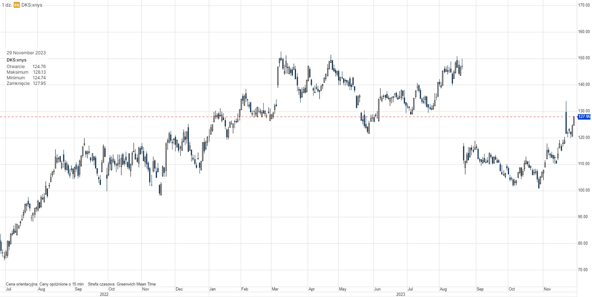 Po wynikach za 2q23 notowania spółki zanurkowały, spadając o 23%. Dick’s Sporting Goods mierzyło się wtedy z podobnymi problemami, co cały segment sprzedaży detalicznej wynikających ze zorganizowanych kradzieży, generujących coraz większe straty. Pozytywne nastroje zarządu po wynikach za 3 kwartał dają szansę na odwrócenie się niefortunnych trendów w spółce.
