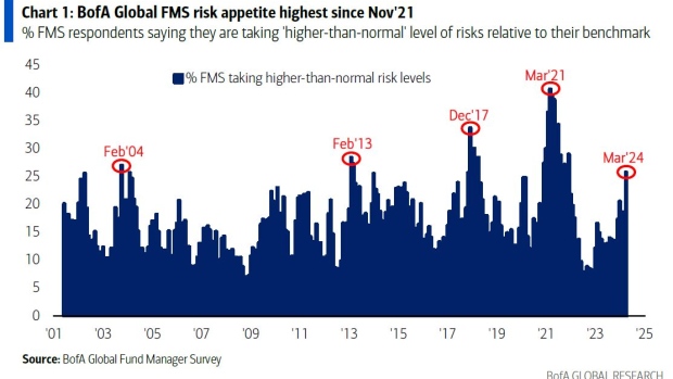 Zarządzający funduszami poszukują większej globalnej ekspozycji. Badanie Bank of America pokazuje, że apetyt na ryzyko jest najwyższy od listopada 2021 r., a konsensus nadal zakłada łagodne lądowanie gospodarki. Alokacja w akcje jest na dwuletnim szczycie, ale pozycjonowanie w USA pozostaje wysokie.