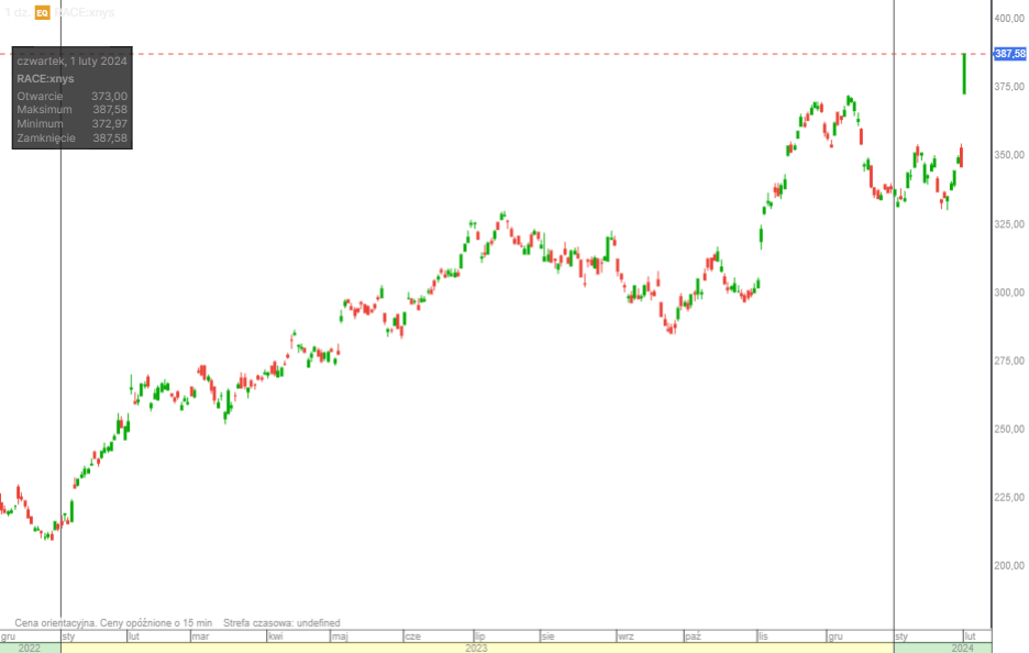 Patrząc w przyszłość, Ferrari prognozuje, że w 2024 r. zysk na akcję przekroczy 7,50 euro przy sprzedaży na poziomie 6,4 mld euro. Aktualne prognozy Wall Street wynoszą odpowiednio 7,54 euro i 6,4 mld euro, co wskazuje na zgodność oczekiwań.