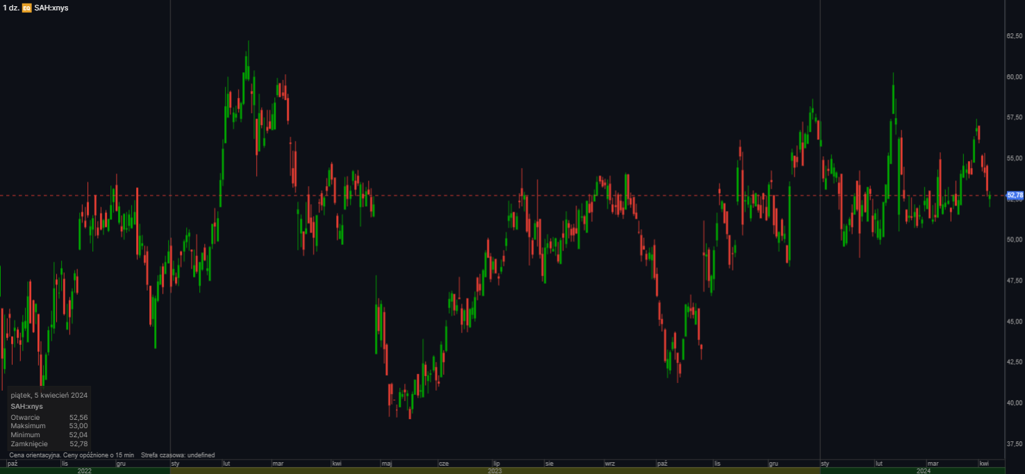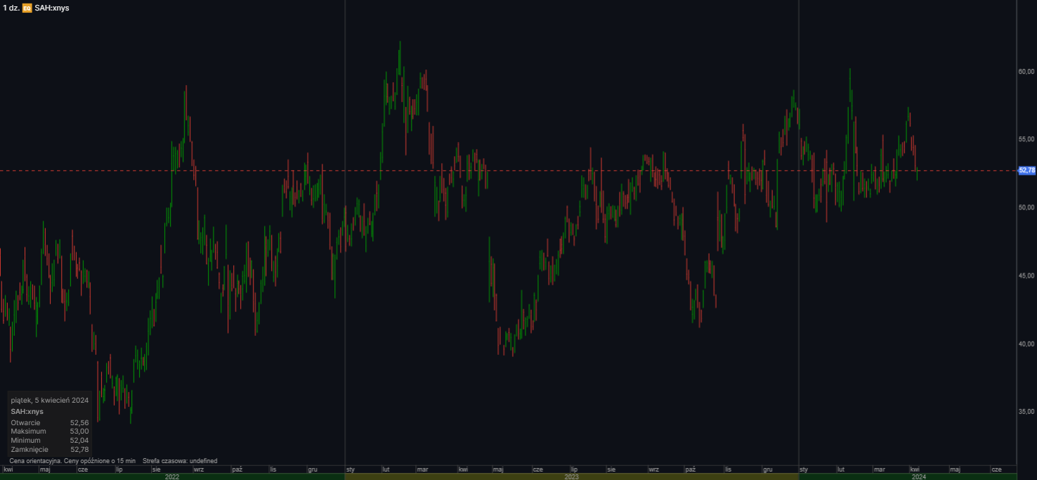 W piątek akcje SAH spadły o 0,6%, otwierając się na poziomie 52,76 USD. Wskaźniki płynności i zadłużenia firmy wskazują na umiarkowaną pozycję finansową. Kapitalizacja rynkowa wynosi 1,79 mld USD, a wskaźnik ceny do zysku 10,62. Analitycy z Wall Street mają mieszane opinie na temat akcji SAH, z konsensusową oceną "trzymaj" i ceną docelową 53,40 USD.