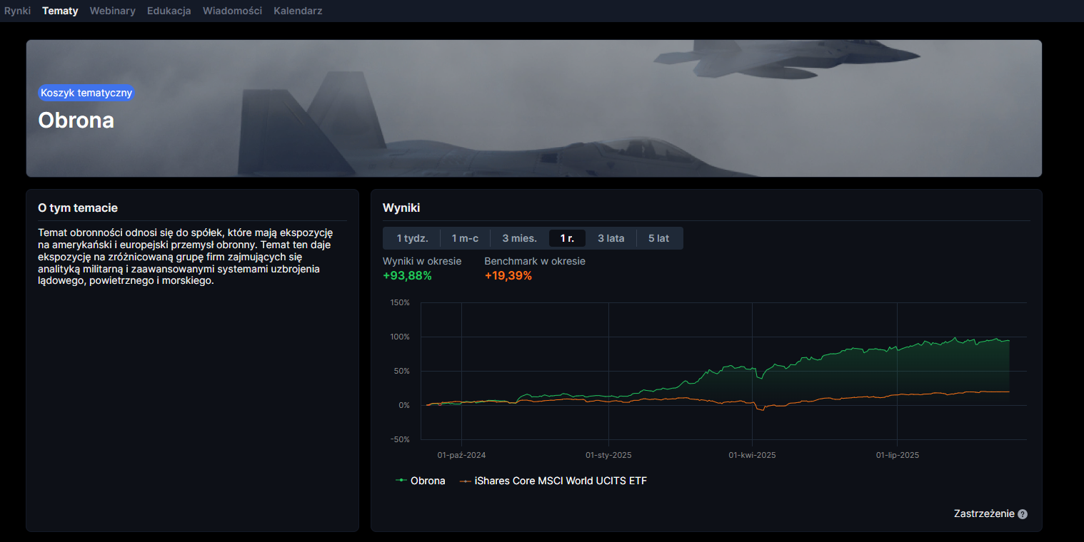 W ciągu ostatnich 12 miesięcy koszyk obronności (spółki zbrojeniowe) Saxo zrobił to, co do niedawna wydawało się mało prawdopodobne dla niszowej tematyki - wystrzelił o ok. +94% i zdeklasował szeroki rynek. Na wykresie widać to jak na dłoni: linia „Obrona” odrywa się od benchmarku iShares Core MSCI World UCITS ETF, który urósł o niespełna +19%. Różnica blisko 75 pkt proc. to nie tylko efekt geopolityki. To również konsekwencja długiego cyklu przezbrojeń, zamówień finansowanych z budżetów publicznych i przenikania nowej technologii do „starej” zbrojeniówki.