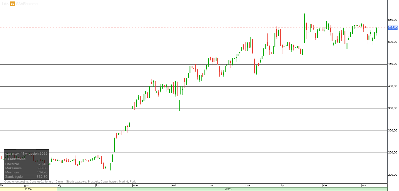 Finansowo jedzie z górki: w Q2’25 przychody urosły o 30,4% r/r do SEK 19,786 mld, EBIT +49% do SEK 1,977 mld, marża 10,0%. Najważniejsze jednak jest „paliwo na jutro” – backlog na rekordowym poziomie SEK 197,552 mld (+8%), co przekłada się na widoczność przychodów i pozwala potwierdzić cele na 2025: co najmniej +20% sprzedaży i marża EBIT powyżej 9,5%.