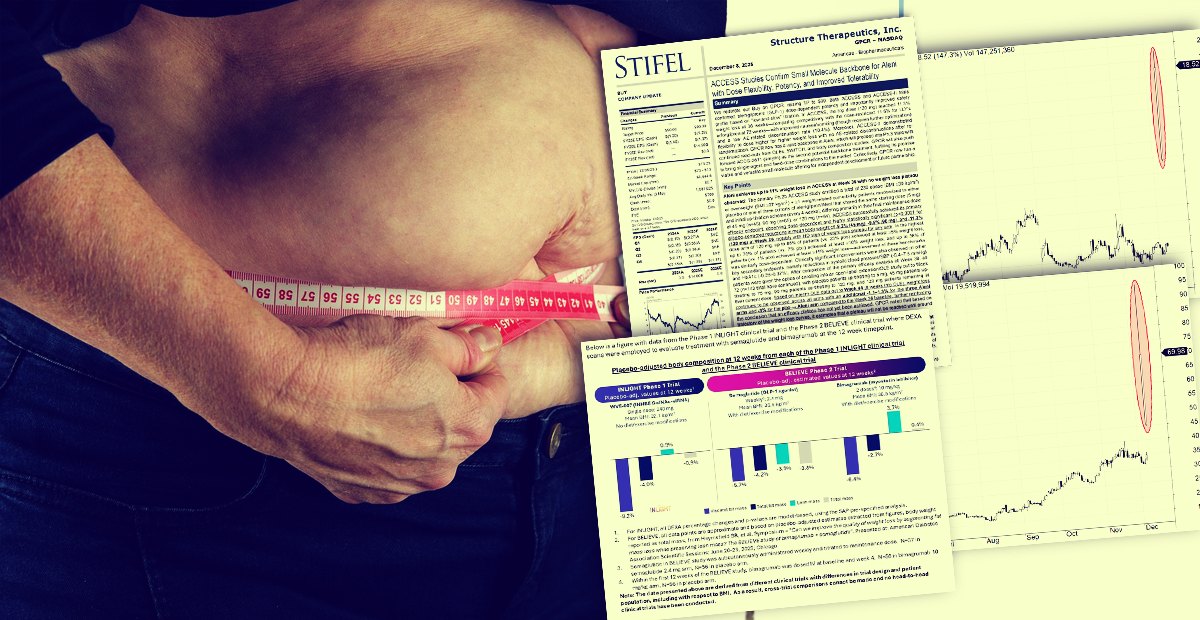 Po drugiej stronie równania mieliśmy euforię. Akcje Structure Therapeutics podwoiły wartość, a WAVE Life Sciences jeszcze mocniej przyspieszyło - wzrosty sięgały ok. 125%. To klasyczna scena z rynku biotechnologii: kilka linijek danych klinicznych potrafi w jeden dzień przestawić wyceny zarówno niszowych spółek, jak i globalnych gigantów farmacji.