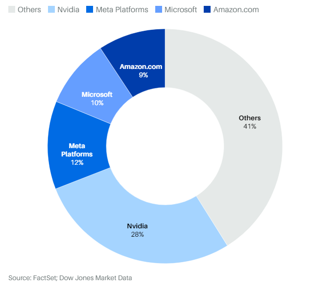 Zaskakujący wzrost Nvidii ma ogromny wpływ na indeks. Niemal jedna trzecia zysków S&P 500, czyli 2,7 biliona dolarów od początku roku, pochodzi zaledwie z jednej akcji - Nvidii. Meta Platforms odpowiada za 12% wzrostu indeksu, a Microsoft i Amazon.com za 10% i 9% odpowiednio.