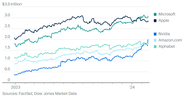 Microsoft wyprzedził Apple pod względem kapitalizacji rynkowej, a Nvidia wyprzedziła Amazon i Alphabet.