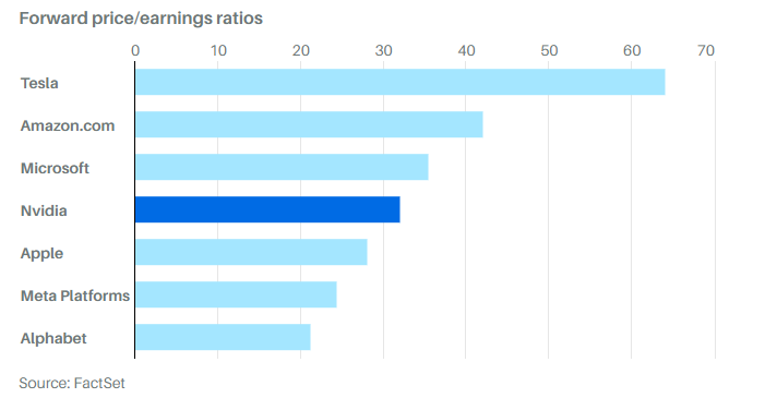 W roku fiskalnym 2025, zakończonym w styczniu przyszłego roku, analitycy przewidują, że Nvidia osiągnie zysk na poziomie 24,6 USD na akcję, co stanowi prawie dwukrotny wzrost w porównaniu z rokiem poprzednim i siedmiokrotny wzrost w porównaniu z rokiem fiskalnym 2023. Akcje Nvidii są obecnie notowane na poziomie 32-krotności przyszłych zysków, wyprzedzając czołowe firmy takie jak Apple, Meta i Alphabet, ale pozostając tańsze od Microsoftu, Amazona i Tesli.