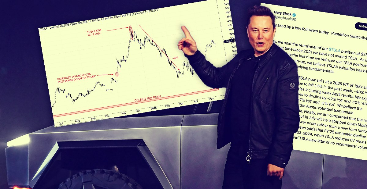 Problem w tym, że inwestorzy już dziś płacą za przyszłość, która może się wydarzyć. Tesla handluje przy wycenie około 180 razy prognozowany zysk za 2025 rok. Dla porównania: S&P 500 oscyluje wokół poziomu 22. Dla Gary’ego Blacka, współzałożyciela funduszu ETF One Global i długoletniego byczego inwestora Tesli, to było za dużo. Sprzedał wszystkie swoje akcje — po raz pierwszy od 2021 roku. Utrzymał wprawdzie cenę docelową na poziomie 310 dol., ale uznał, że czas na pauzę. A może — na zejście na ziemię.