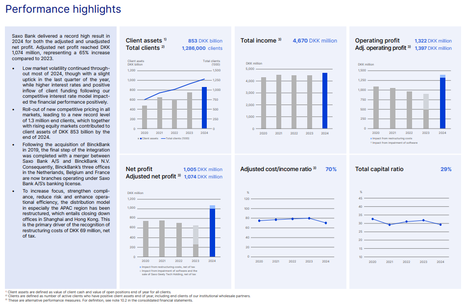 Saxo Bank opublikował swoje wyniki finansowe za 2024 rok, osiągając najlepsze rezultaty w historii firmy. Zysk netto w tym okresie wyniósł 135 mln EUR, co stanowi wzrost o 287% w porównaniu do 35 mln EUR osiągniętych w roku 2023. Skorygowany zysk netto osiągnął wartość 144 mln EUR.