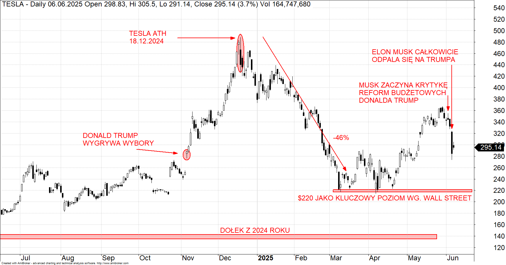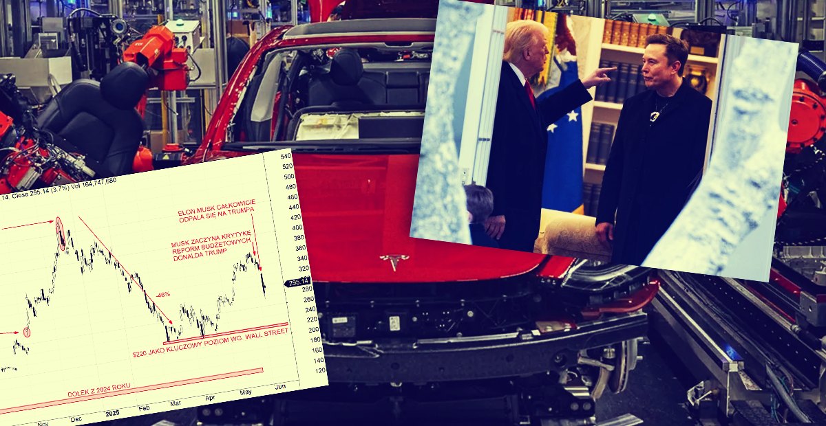 Akcje Tesli rozpoczęły tydzień od spadku — o 1,8% w porannym handlu — podczas gdy amerykańskie indeksy S&P 500 i Dow Jones trzymały się stabilnie. To kontynuacja niepokoju po ubiegłotygodniowym załamaniu notowań producenta aut elektrycznych, które zakończyło się niemal 15-procentową przeceną. Powód? Publiczna wymiana ciosów między Elonem Muskiem a prezydentem Donaldem Trumpem, wywołana krytyką pakietu fiskalnego. W normalnych okolicznościach taka potyczka mogłaby pozostać medialną ciekawostką. Ale tu mamy do czynienia z najbogatszym człowiekiem świata i najbardziej wartościową spółką motoryzacyjną na globie.