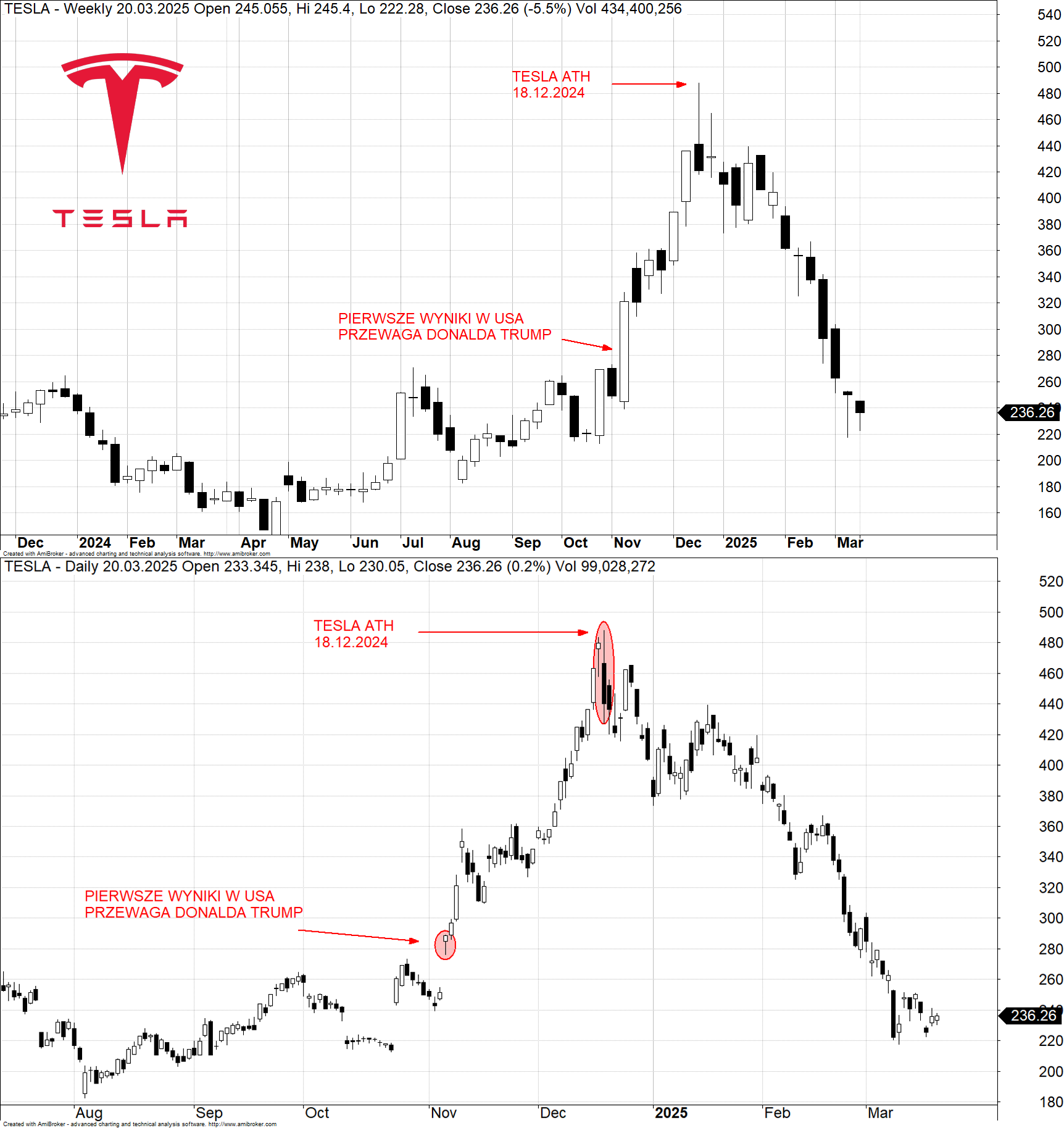 Spadki były częściowo konsekwencją dynamicznych wzrostów po wyborach prezydenckich w USA. Od 5 listopada do połowy grudnia akcje Tesli wzrosły z 250 do niemal 490 dolarów za sztukę. Inwestorzy liczyli, że druga kadencja Donalda Trumpa oznaczać będzie przyjazne regulacje dla przemysłu motoryzacyjnego, szczególnie w zakresie technologii autonomicznej jazdy. Tesla planuje uruchomić usługę robotaxi w 2025 roku.