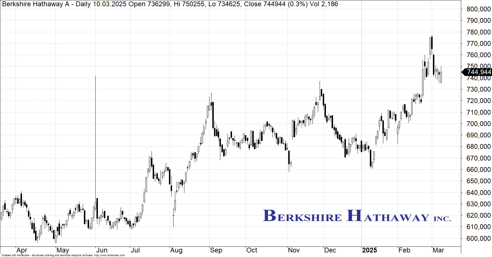 Pomimo defensywnej strategii, Berkshire wciąż cieszy się uznaniem inwestorów. Akcje klasy A spółki wzrosły o 9% od początku roku, wyraźnie dystansując indeks S&P 500. W poniedziałek akcje klasy A podrożały o 0,3%, osiągając wartość około 745 000 dolarów, podczas gdy akcje klasy B wzrosły o 0,3% do 497,10 dolarów. Tymczasem S&P 500 zanotował spadek o 2,7%.