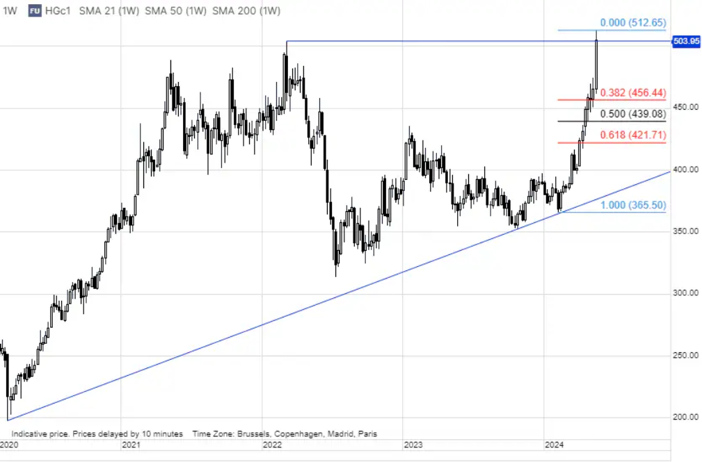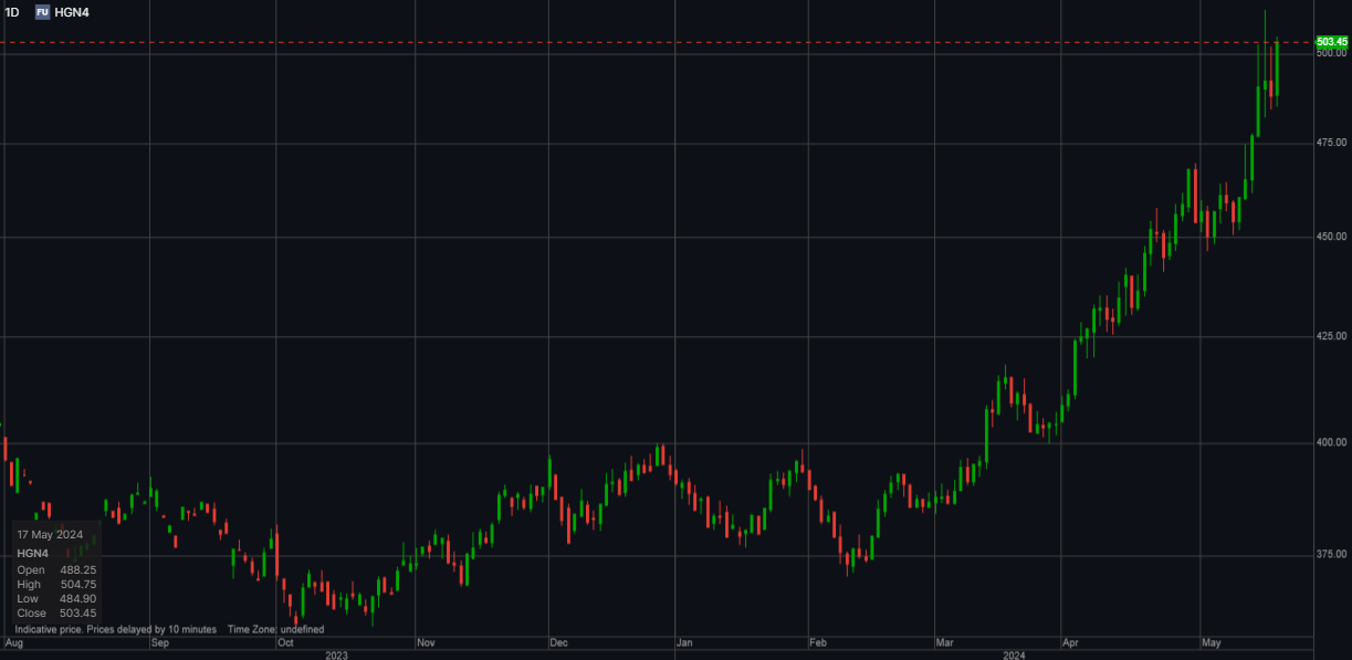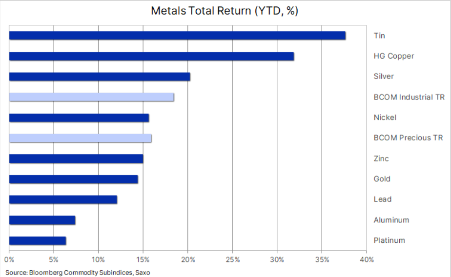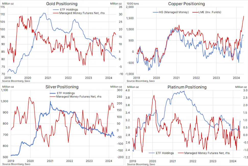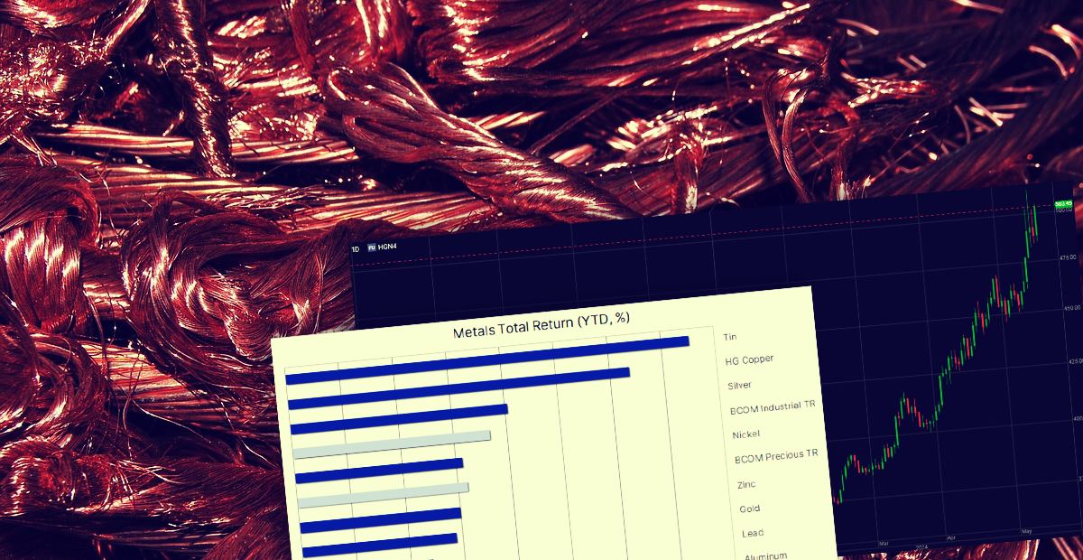 Analitycy Saxo w swojej ostatniej prognozie na pierwszy kwartał roku podkreślał istotność trendu nazwanego „Erą Metali", który konsekwentnie zyskuje na znaczeniu. Złoto, srebro, miedź oraz platyna, wyłaniają się jako preferowane surowce, notując znaczący wzrost. Podczas gdy złoto stabilizuje się po dynamicznych wzrostach z marca i kwietnia, miedź, po krótkiej chwili stagnacji na początku miesiąca, kontynuuje swój wzrostowy trend, osiągając roczny przyrost o ponad 30% i ustanawiając nowe rekordy.