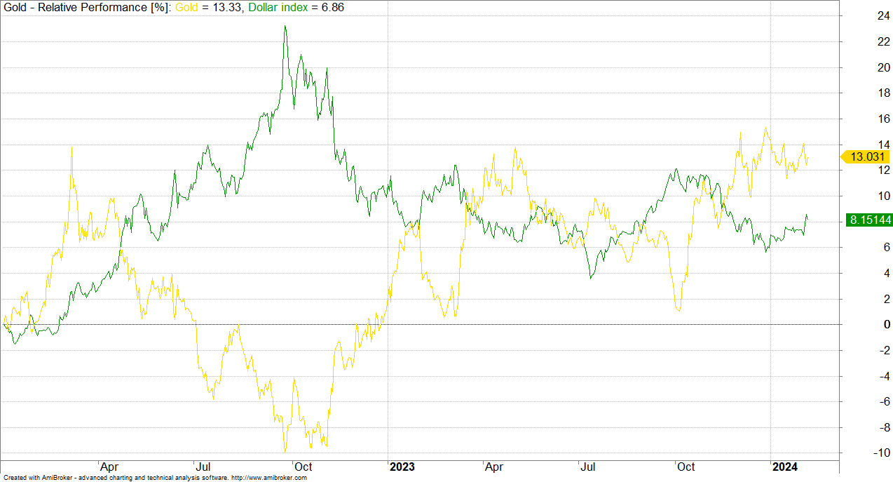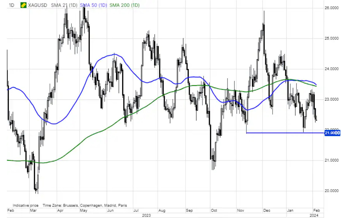Zmiana nastrojów rynkowych spowodowała także ruchy w wycenie metali szlachetnych. Złoto, które wraz z rosnącym przekonaniem rynków o szybkim luzowaniu polityki pieniężnej zyskiwało mocno pod koniec 2023 r., a także wybiło nowe szczyty w grudniu, teraz wyraźnie traci momentum.