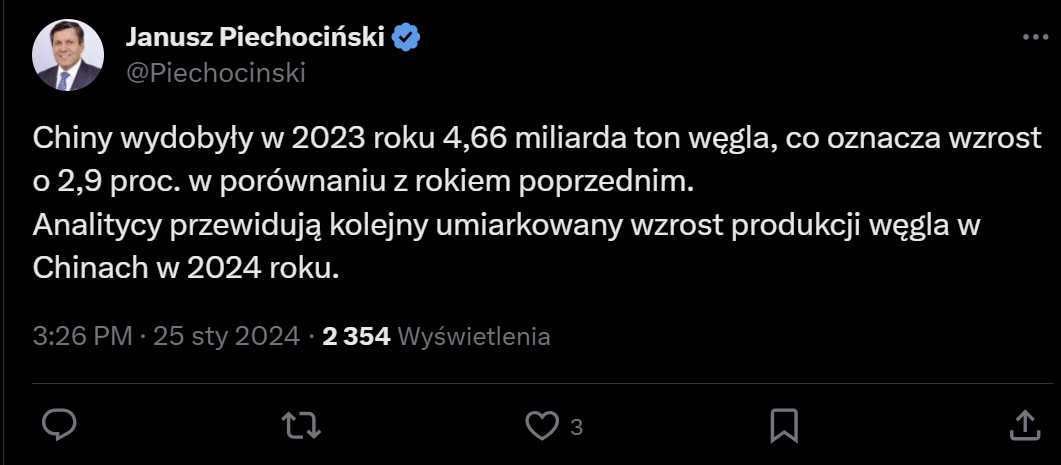 Chiny wydobyły w 2023 roku 4,66 miliarda ton węgla, co oznacza wzrost o 2,9 proc. w porównaniu z rokiem poprzednim. Analitycy przewidują kolejny umiarkowany wzrost produkcji węgla w Chinach w 2024 roku.