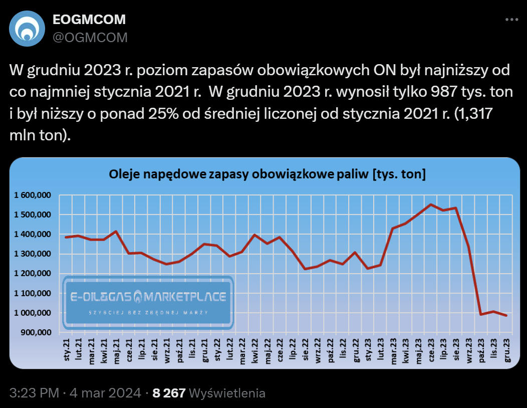 W grudniu 2023 r. poziom zapasów obowiązkowych ON był najniższy od co najmniej stycznia 2021 r. W grudniu 2023 r. wynosił tylko 987 tys. ton i był niższy o ponad 25% od średniej liczonej od stycznia 2021 r. (1,317 mln ton).