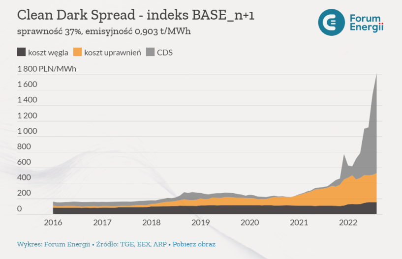 Według Forum Energii dokładnie rok temu w przypadku krajowej energetyki CDS wynosił 18,1 zł za MWh, koszt uprawnień CO2 – 232 zł, a węgla 111,2 zł. Dziś jest to kolejno: CDS - 1287,4, uprawnienia – 373,4, węgiel – 156.