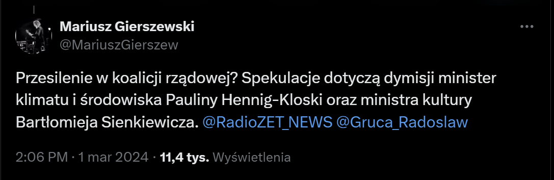 Mariusz Gierszewski, dziennikarz Radia Zet, sugeruje że ze swoim stanowiskiem może się pożegnać minister klimatu, Paulina Hennig – Kloska.