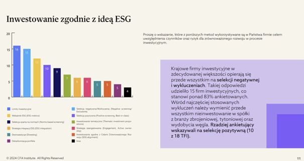 Wnioski płynące z likwidacji indeksu WIG-ESG są także mocno skorelowane z badaniem przeprowadzonym przez Komitet ESG CFA Society Poland (zaprezentowano je w kwietniu 2024 r. wspólnie z Bloombergiem).