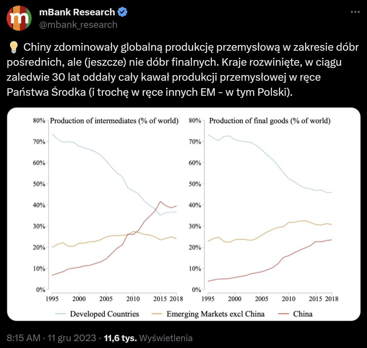 Ciekawy wątek mBank Research, pokazujący, że po trzydziestu latach ustępowania „pola gry” przez kraje zachodnie, Chiny zdominowały globalną produkcję przemysłową w zakresie dóbr pośrednich. Dziś walka toczy się o dobra finalne.