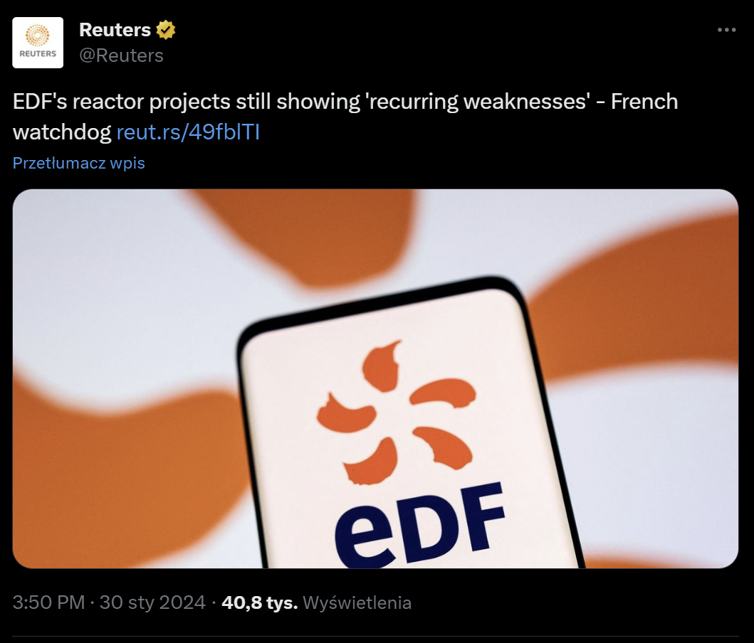 Francuski organ nadzoru informuje, że projekty reaktorów atomowych EDF nadal mają „problemy”.