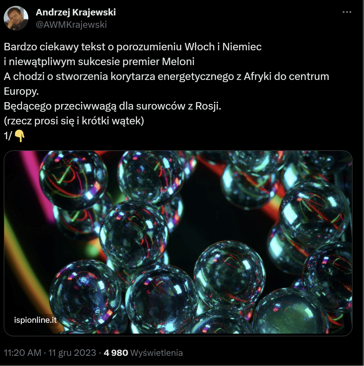Ciekawy wątek na temat zacieśniającej się kooperacji energetycznej Niemiec i Włoch można znaleźć na koncie redaktora Andrzeja Krajewskiego z DGP. Niemiecka gospodarka łapie zadyszkę z powodu „odstawienia” taniego gazu z Rosji i poszukuje wszelkich alternatyw. Z propozycją takiej alternatywy wystąpiła włoska premier Giorgia Meloni. Koncept zakłada uczynienie z Włoch pośrednika pomiędzy Afryką i Unią Europejską w dostępie do surowców energetycznych. Bynajmniej nie jest to żadne novum. Tradycja kooperacji Włoch z Libią jest bardzo długa, a „nowy pomysł” wydaje się jedynie wielkoformatowym odświeżeniem tego konceptu obejmującym m.in. Tunezję. Jednym z elementów propozycji Meloni ma być dostarczanie wodoru także do Europy Środkowej poprzez połączenie transalpejskie. Polska powinna uważnie się temu przyglądać.