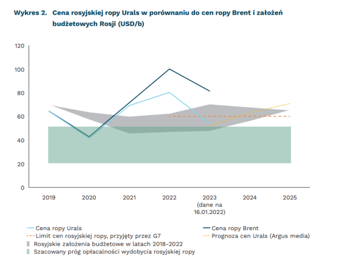 „Cena ropy Urals przyjęta w rosyjskim budżecie na 2023 r. wynosi 70 USD/b i znacząco odstaje od obecnej i prognoz rynkowych. Średnia cena Urals w styczniu 2023 r. wynosiła ok. 54 USD/b. Według agencji Argus Media, średnia cena ropy Urals w 2023 r. wyniesie tylko 53,1 USD/b. Dochody budżetowe Rosji z podatków od wydobycia i eksportu ropy w 2023 r. mogą być przeszacowane nawet o 26%, co oznaczałoby zawyżenie wpływów do budżetu o 7,5%” – dodaje think tank.