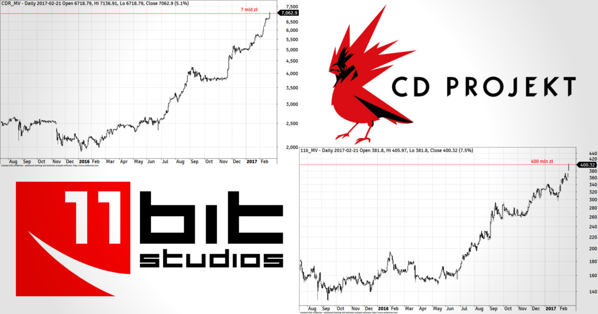 Do godz. 11:40 papiery CD Projekt i 11 bit studios były jednymi z najmocniej drożejących na polskiej giełdzie. Ich cena urosła, odpowiednio, o 5,1 proc. i 7 proc.