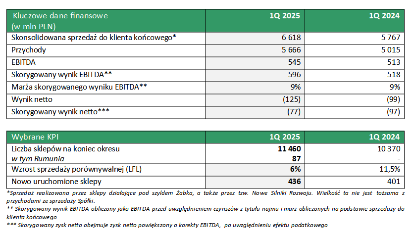 Grupa Żabka utrzymała silny trend wzrostu sprzedaży w pierwszym kwartale 2025 roku, który wynikał z dalszego rozwoju sieci sklepów (na koniec marca br. liczyła ona już 11 460 placówek), zwiększenia sprzedaży porównywalnej (LFL) o 6,0%, oraz wzrostu sprzedaży w kanałach cyfrowych i rozwoju działalności w Rumunii. Nowo otwarte sklepy w Polsce charakteryzowały się wyższą dzienną liczbą transakcji w porównaniu do sklepów otwieranych w poprzednich okresach. W efekcie sprzedaż do klienta końcowego wzrosła rok do roku o prawie 15%, osiągając wartość 6,6 mld zł.