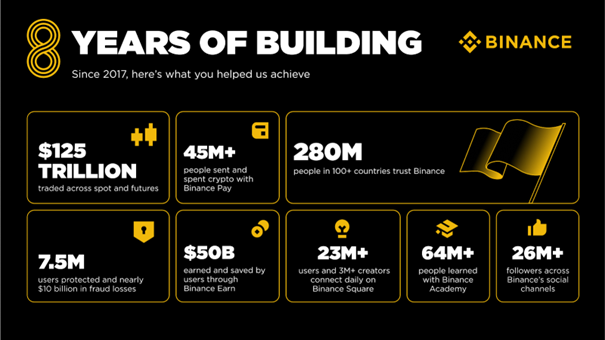 Binance, globalny ekosystem blockchain stojący za największą na świecie giełdą kryptowalut pod względem wolumenu obrotu i liczby użytkowników, świętuje osiem lat rozwoju. Począwszy od wymiany krypto-krypto w 2017 roku, Binance przekształciło się w społeczność liczącą 280 milionów użytkowników w ponad 100 krajach — obecnie niemal 1 na 28 osób na świecie jest zarejestrowana na Binance. Każdego tygodnia około milion nowych użytkowników dołącza do platformy, co odzwierciedla rosnącą adopcję aktywów cyfrowych.