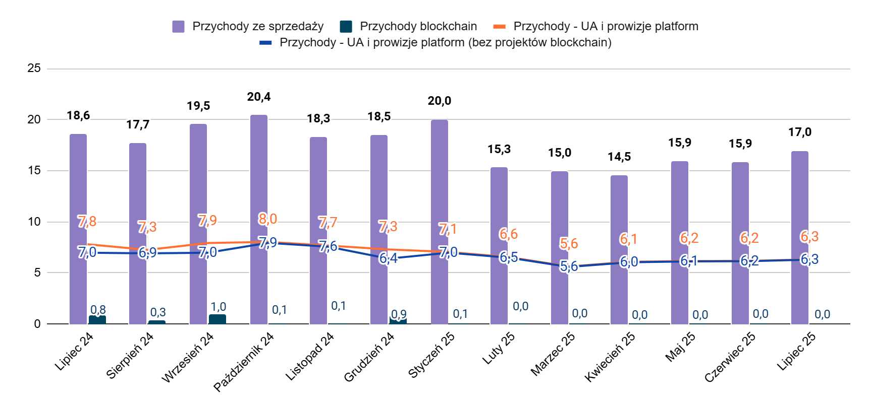 Przychody Grupy BoomBit w lipcu 2025 r. wyniosły 17,0 mln PLN (+6,9% m/m), w tym 16,9 mln PLN z gier mobilnych. Wydatki na User Acquisition zwiększyły się do 9,3 mln PLN (+13,3% m/m), a koszty prowizji platform spadły do 1,4 mln PLN (-9,9% m/m). Grupa miała 20,0 mln pobrań i 6,3 mln PLN (+2,5% m/m) przychodów pomniejszonych o UA i prowizje platform. Bez uwzględniania przychodów z projektów blockchain wynik ten wyniósł 6,3 mln PLN (+2,4% m/m).