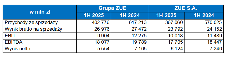 Przychody ze sprzedaży Grupy ZUE w I półroczu 2025 r. wyniosły 402,8 mln zł. Niższy poziom przychodów rok do roku przełożył się na wynik netto wynoszący 5,6 mln zł. Grupa wypracowała jednak wyraźnie lepszą r/r marżę brutto na sprzedaży w wysokości 6,7%, w porównaniu do 4,5% rok wcześniej.