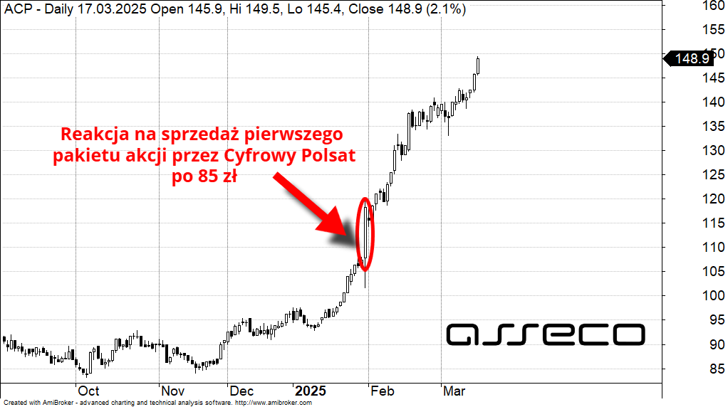 Następnie, 4 lutego 2025 roku, Asseco Poland zawarło warunkową umowę sprzedaży akcji własnych stanowiących 14,84% kapitału zakładowego, również na rzecz TSS. Cena za jedną akcję została ustalona na tym samym poziomie. Zdjęcie podaży z rynku uwolniło dużą wartość na akcjach spółki, a kurs poszybował w okolice 150 zł.