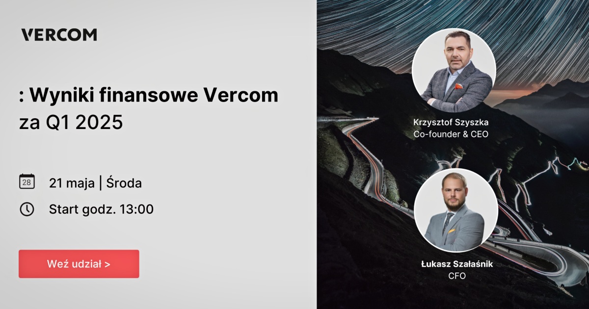 Już 20 maja 2025 roku spółka opublikuje skonsolidowany raport za I kwartał 2025 roku. W związku z tym zapraszamy na webinar z przedstawicielami spółki – prezesem Krzysztofem Szyszką oraz Łukaszem Szałaśnikiem, dyrektorem finansowym. Podczas spotkania omówione zostaną wyniki za I kw. 2025 r. oraz najważniejsze wydarzenia w grupie Vercom.
