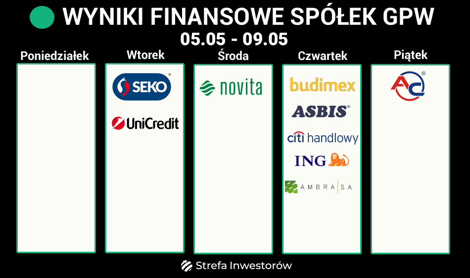 W środę, 7 maja wyniki przedstawi spółka z sektora przemysłowego, Novita (sWIG80). Zaś Czwartek, 8 maja będzie najbardziej intensywnym dniem tygodnia, kiedy raporty opublikuje osiem spółek, w tym cztery z indeksów WIG20 i mWIG40: Budimex (WIG20) – sektor budowlany, ASBIS (mWIG40) – sektor IT i dystrybucja elektroniki, Ambra (sWIG80) oraz dwa banki: Handowy i ING.