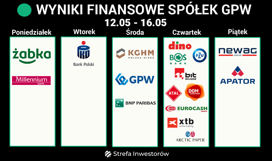 Na wtorek, 14 maja zaplanował publikację raportu PKO Bank Polski (WIG20), Zaś w środę możemy spodziewać się raportów od KGHM (WIG20), GPW (mWIG40) oraz trzech spółek z sWIG80: BNP Paribas Bank Polska, Sygnity (IT), oraz Mennica Polska (przemysł metali szlachetnych), która opublikuje raport roczny.
