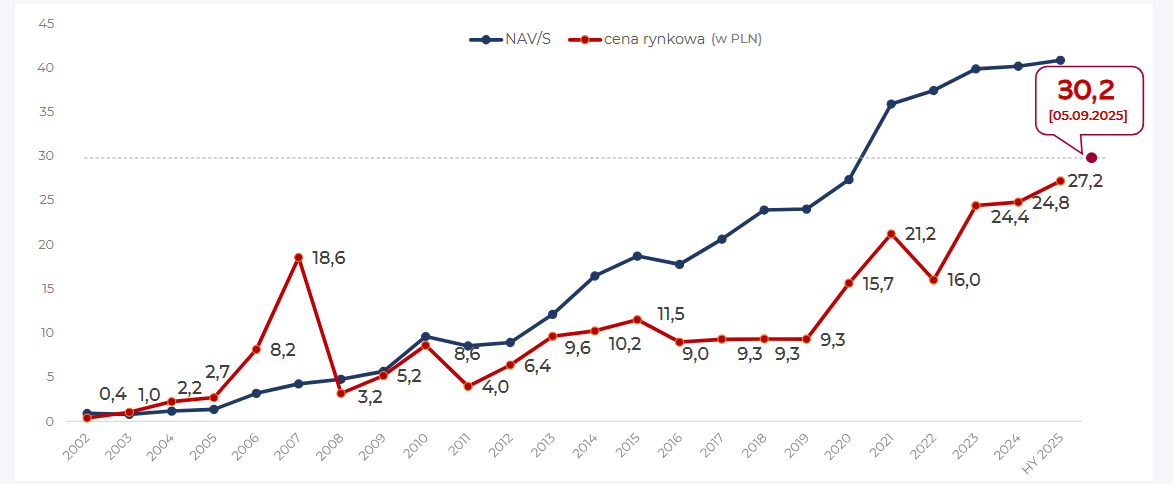 Dziś jesteśmy wyceniani mniej więcej z 30-procentowym dyskontem względem posiadanych aktywów netto. Ta różnica się zmniejsza, bo kurs akcji rośnie, ale nie aż tak znacząco, ponieważ z drugiej strony nasze inwestycje zyskują na wartości, a co za tym idzie – rośnie wartość aktywów netto w portfelu.